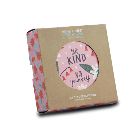 This set of 4 ceramic Bonbi Forest coasters is a lovely addition to any home. Each coaster features a different botanical illustration and message of positivity. A wonderful way to bring a touch of nature into your living space, the coasters are also packaged in a printed gift box.