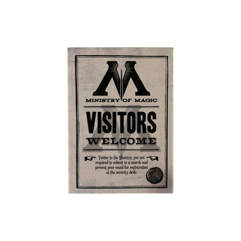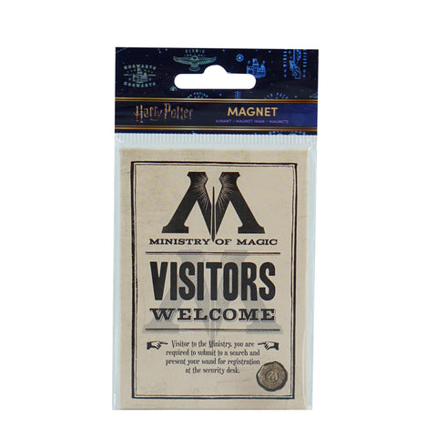 This Harry Potter magnet features the Ministry of Magic design with the phrase 'Visitors Welcome'