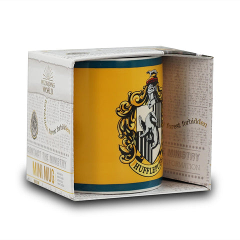 This Harry Potter mini mug features the Hufflepuff house crest on a dark green background on the front, and the Harry Potter logo on the reverse. Hufflepuff is the house that represents hard work, patience, justice, and loyalty. This stoneware mini mug is suitable for espressos.